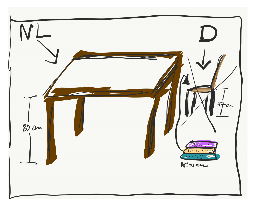 Mein Mann und ich kauften uns in Moers einen neuen Esszimmertisch (hergestellt in Holland) und nahmen ihn gleich mit. Zuhause wurde er sofort aufgebaut und dann setzten wir uns an den Tisch. Und dann kam der Moment unserer verblüfften Gesichter: Wir konnten gerade noch über die Tischkante gucken! (Etwas übertrieben formuliert, aber es kam uns so vor). Der Zollstock bewies den Verdacht: Der neue Tisch war 80 cm hoch, unser alter Tisch hatte die Höhe von 73 cm. Wir brauchten also schnell neue Stühle (wollten wir sowieso auswechseln, aber erst später), denn auf den alten saß man mit Kissen unter dem Popo wie die Prinzessin auf der Erbse. So fuhr ich am nächsten Tag noch einmal zu dem Moerser Möbelladen, um schon mal bei den Stühlen eine Vorauswahl zu treffen. Unsere Stühle hatten die Höhe von 47 cm, die neuen sollten mindestens 50 cm hoch sein. Der Verkäufer schüttelte den Kopf, 46-47 cm seien Standardmaße für Stühle in Deutschland, 50 cm Stühle gäbe es nicht. Auf meine Frage, wie man an so einem hohen Tisch mit 47er Stühlen normal sitzen solle meinte der Verkäufer, dass dies Gewöhnungssache sei, wir hätten halt bisher an einem extrem niedrigen Tisch gesessen. Durch den hohen Tisch würden wir zukünftig viel gerader sitzen. Ich sei die erste, die damit nicht klar käme. Sehr irritiert, diesmal mit dummen Gesicht, verließ ich den Laden und besuchte am Abend diverse Onlineshops großer Möbelhäuser. 47 cm-Stühle, aber die Tische hatten alle eine Höhe von 73 – 75 cm, unser alter Tisch war also „normal“, der neue aus Holland fiel aus dem Rahmen!