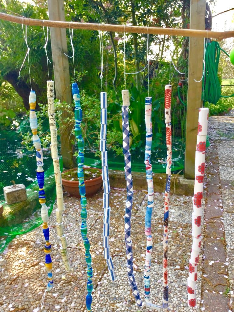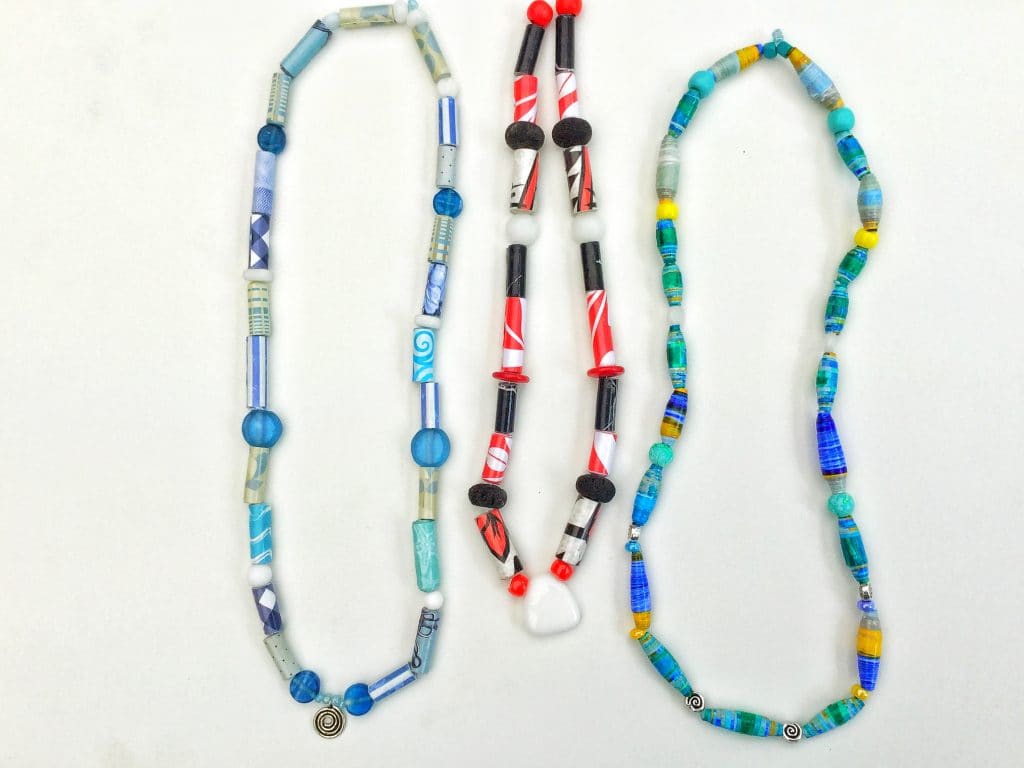 Und das sind die fertigen Ketten. Ich kombiniere die Papierperlen gerne mit anderen Perlen, aber es gibt auch in der „Papierperlenszene“ auf YouTube Puritanerinnen, die das ablehnen.