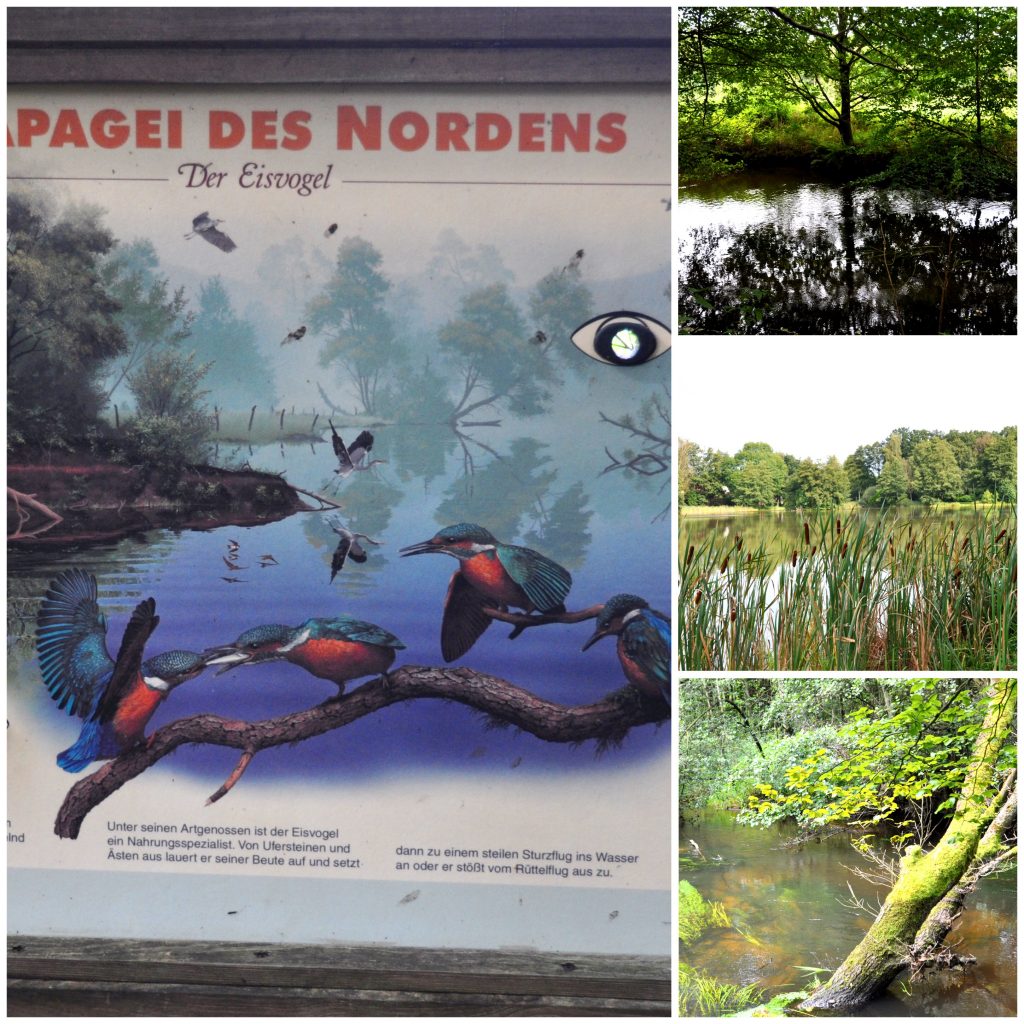 Auf einer Schautafel wurde erklärt, was man alles auf dem Müdener Teilstück des Wanderweges sehen konnte und da waren u.a. auch Eisvögel aufgeführt. Da ich noch nie einen Eisvogel von Nahem gesehen habe und ich mir das sehr wünsche, gingen wir auf dem Wanderweg ein paar Kilometer, vorbei an einem See, durch Felder und durch Wald und dann an dem Ötzeflüsschen entlang bis zu der speziellen Eisvogel-Schautafel.