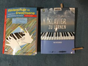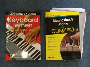 Und jetzt Klavier spielen? Vom ersten Tag an machte es mir sehr viel Spaß. Das Notenerkennen kam wieder, ich machte Fortschritte, aber dann war der Sommer da und ich hörte auf. Ich eierte herum zwischen Tonleitern üben, ein schweres Stück von Chilli Gonzales mir beibringen und Ministücke selbst „komponieren“, irgendwie merkte ich aber, dass mir noch mehr Grundwissen fehlte, mir fehlte eine Übungslinie. Ich hatte bisher diese beiden Bücher benutzt:
