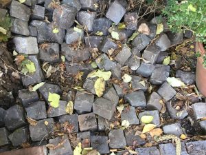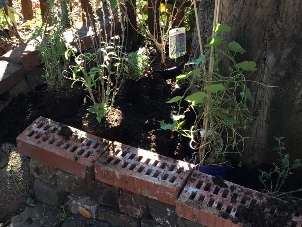 Einen Moment lang kam ich mir wie eine irische Mauerbauerin vor und meine Hochachtung vor irischer Steinstapelkunst wuchs. Meine zwei Reihen Natursteine stabilisierte ich dann noch durch alte Ziegel, bevor ich mit dem Erdeanhäufen begann.