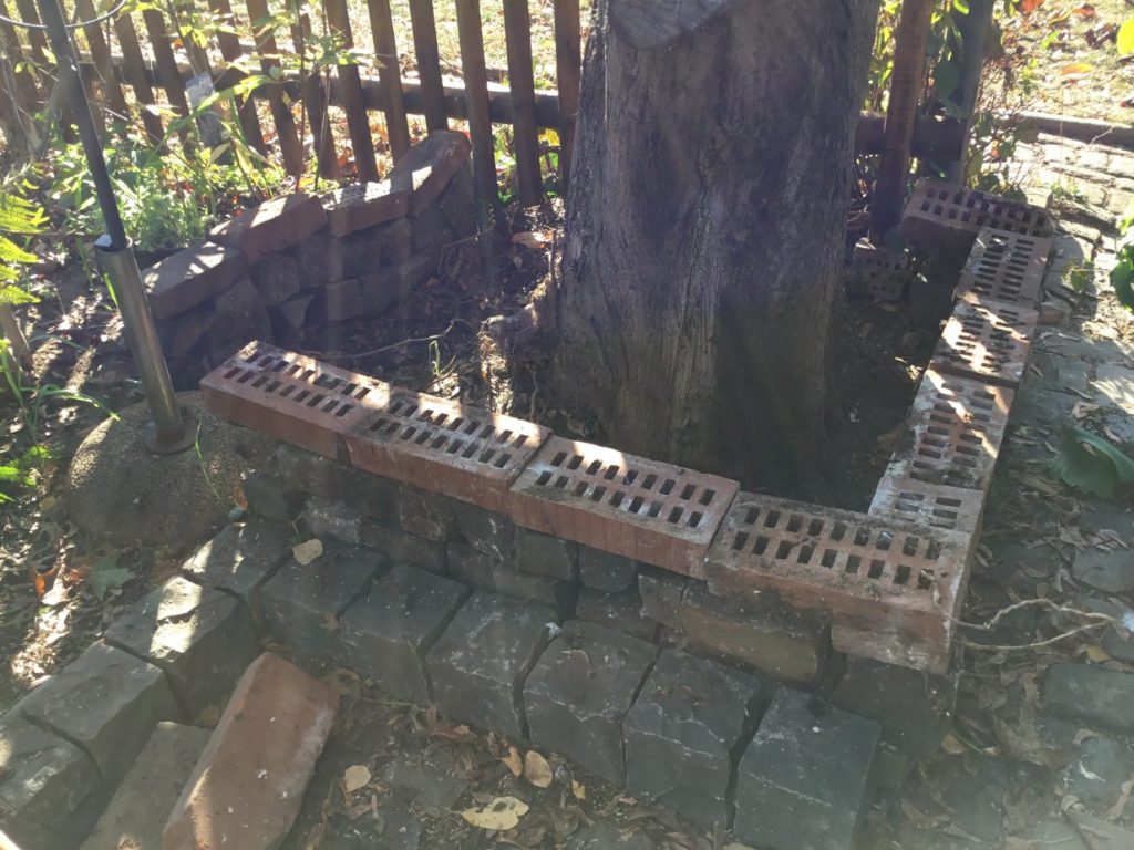 Einen Strauch oder ein Klettergewächs davorzupflanzen wäre das Beste, doch die Erde am Baum ist voller Wurzeln, also keine Chance für eine Neuanpflanzung. Beim Durchblättern eines Gartenbuches kam mir dann eine Idee, die ich vor ein paar Tagen umsetzte. Ein Minihochbeet!