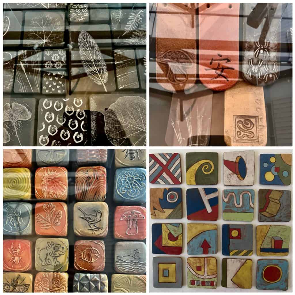 Unten rechts: Mit farbigen Engoben bemalte Keramikfliesen mit dem Titel „Fragmente eines Stadtplans“.