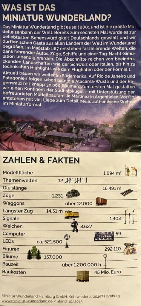 Wir waren nach ca. zehn Jahren mal wieder im Miniatur Wunderland in Hamburg. Es hat sich seitdem vieles getan, denn die Besitzer nutzen inzwischen ein zweites Haus in der Hamburger Speicherstadt. Rio de Janeiro und Patagonien sind hier neu zu bewundern, die Anden, der Regenwald und die Atacama-Wüste warten auf die Fertigstellung.
