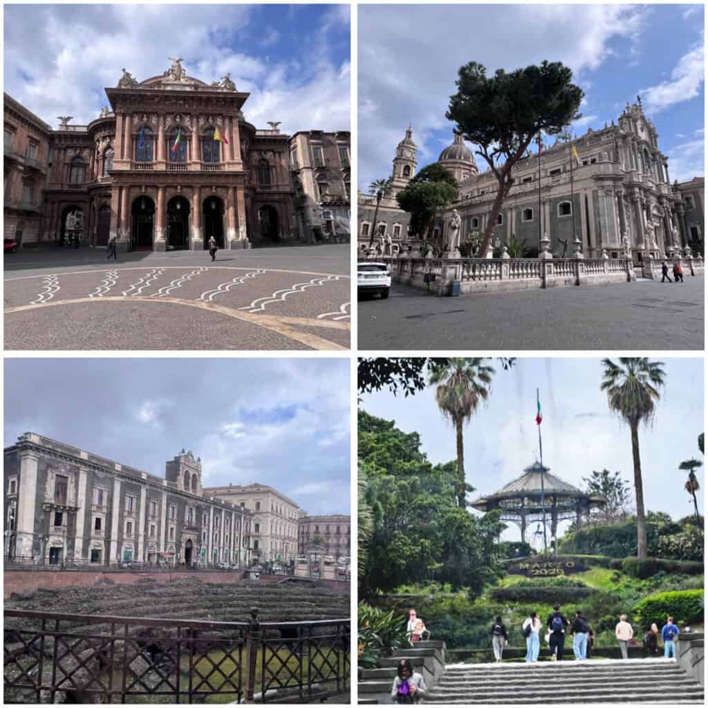 Leider fing es nach dem Besuch zu regnen an und wir entschieden uns, an einer einstündigen Bustour teilzunehmen. Das sollte so sein, denn wir merkten schnell, dass die Strecken zwischen den einzelnen Sehenswürdigkeiten „nicht mal eben“ zu Fuß abgegangen werden können, wie es in manchen Reiseführern steht. Allein die Via Etnea mit prachtvollen Palästen und diversen teuren Geschäften ist knapp 3 Km lang, an einem Ende liegt der botanische Garten von Catania (Foto rechts unten), am anderen Ende das große Amphitheater (Foto unten links).