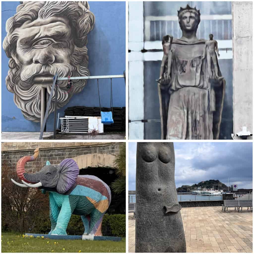 In Hinterhöfen in Catania und auf der Fahrt sahen wir auch mehrere Skulpturen (oft aus Lavastein) und Wandgemälde. Kunst scheint für Catania wichtig zu sein.