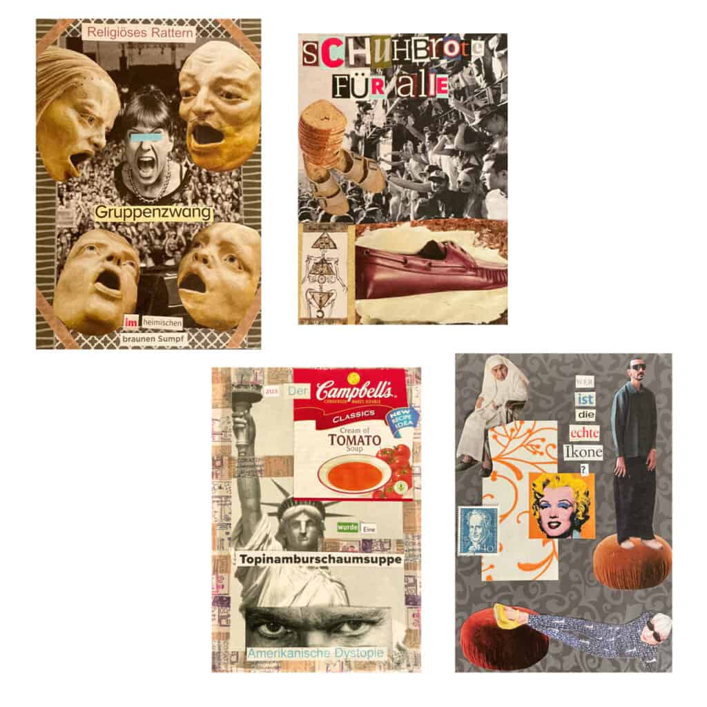 Doch ich wollte Hannah Höchs Tun nachspüren und fing Ende Januar an, selbst Collagen zu kleben. Gerne hätte ich mich mit Hannah unterhalten, wie sie vorgegangen ist, denn schnell merkte ich, dass ich viel Platz brauchte. Als Unterlage nahm ich weißes 280g schweres ca. A5 großes Papier. Entweder kam mir bei einem Wort eine Idee, zu der ich passende Bilder suchen musste oder bei einem Bild machte es „Klick“. So breitete ich mich erst einmal aus…