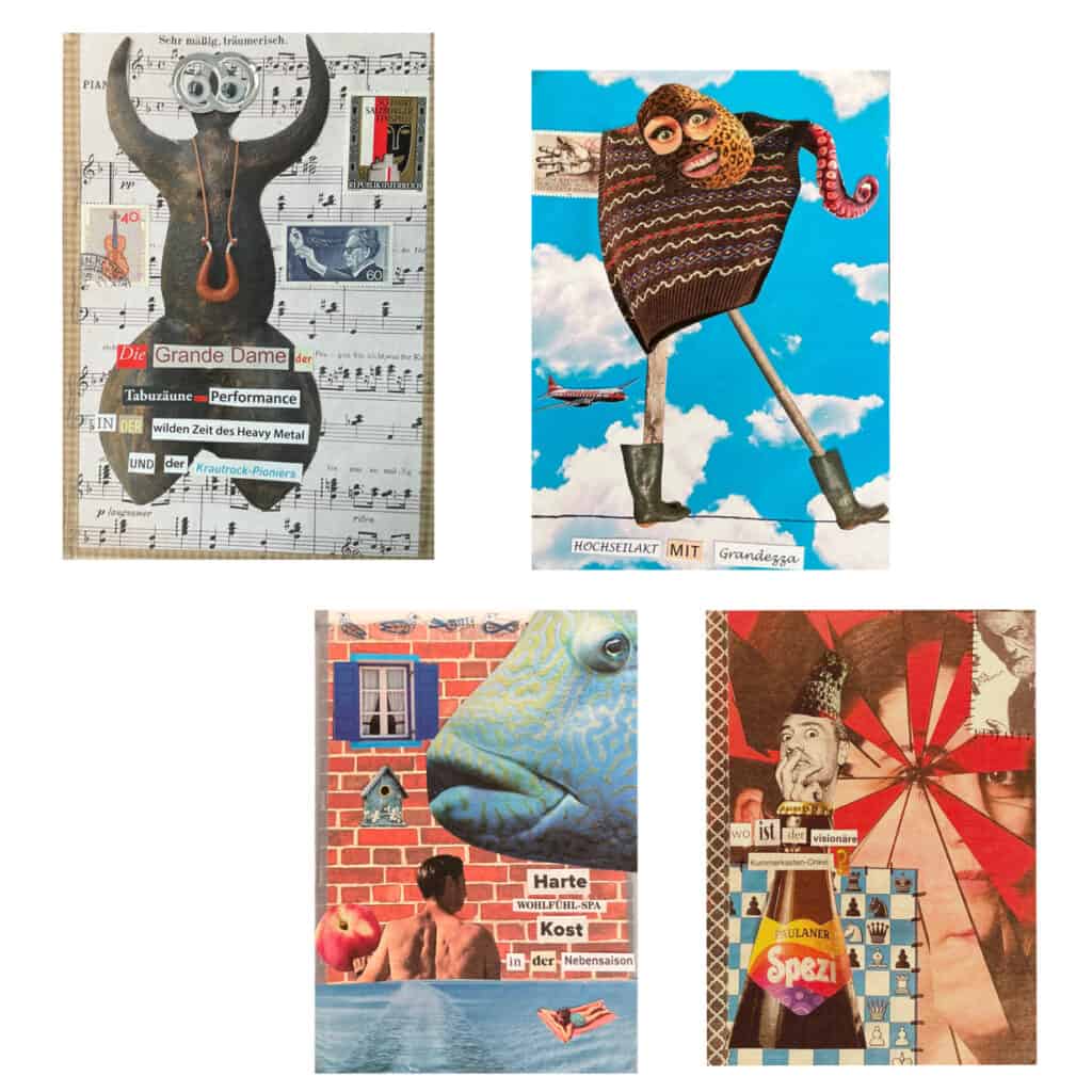 Immer wieder verwarf ich Zusammenstellungen, weil ein Fototeil plötzlich bei einem anderen Bild besser passte. Manchmal war ich „im Flow“, dann passierte einige Tage gar nichts mehr und traurig wurde ich, wenn ich plötzlich nicht mehr von einer Collage überzeugt war und sie frustriert auflöste. Wenn ich nach einer Woche immer noch Spaß an einem Bild hatte, klebte ich die Teile fest.