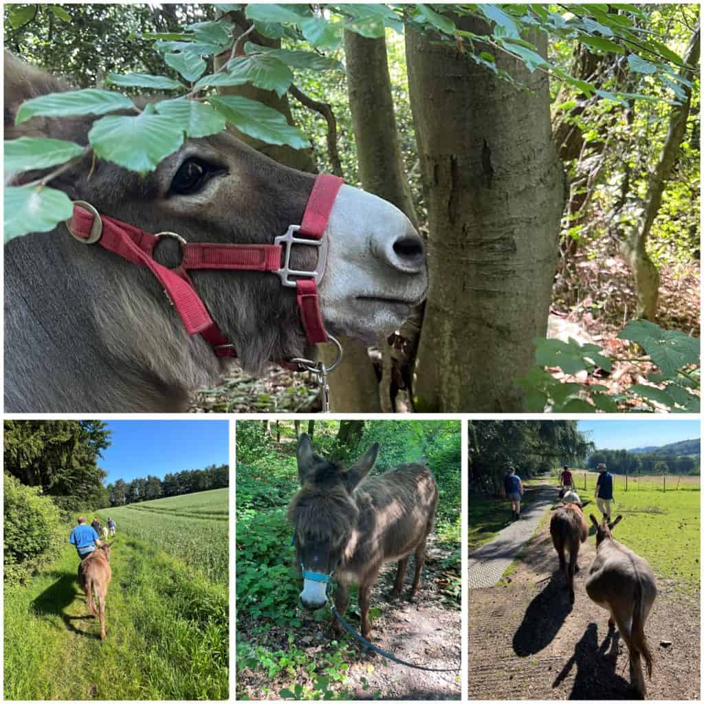 Nachdem wir und ein weiteres Paar die Esel ein bisschen gebürstet und gestreichelt hatten, machten wir uns auf den Weg. Da es ein sehr warmer Tag war, wählte Sabrina eine schattige Strecke durch den nahegelegenen Wald. Schon bald merkten wir, dass jede Eselin eine eigene Persönlichkeit hatte. Mathilde lief gerne vorne, Isabella, ihre Freundin, folgte. Lotte und Elli liebten es ein bisschen gemütlicher. So waren sie auch etwas „cooler“, wenn beispielsweise Spaziergänger mit Hunden vorbei gingen. Die Mädels hatten aber eine Gemeinsamkeit: Die Liebe zu frischen Gräschen! Da musste man sich als Begleitperson dann öfter einmal durchsetzen, um ein Grasen zu vermeiden. Farne oder Ilex waren beispielsweise verboten, da sie für Esel gefährlich sind, Brombeeren und Buchenblättchen hingegen in den Futterpausen sehr willkommen.