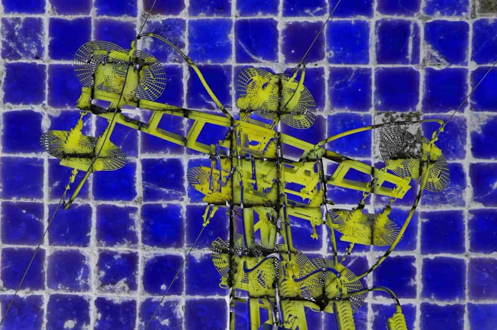 Heute gibt es schon den ersten Bildbeitrag. Diese Fotocollage entstand aus zwei Fotos, die ich im Eingangsbereich unseres Londoner Hotels gemacht habe. Regale, die die Eingangshalle in mehrere Bereiche einteilten, waren mit zerstörten Büchern dekoriert. Ich fühlte mich sehr unwohl.