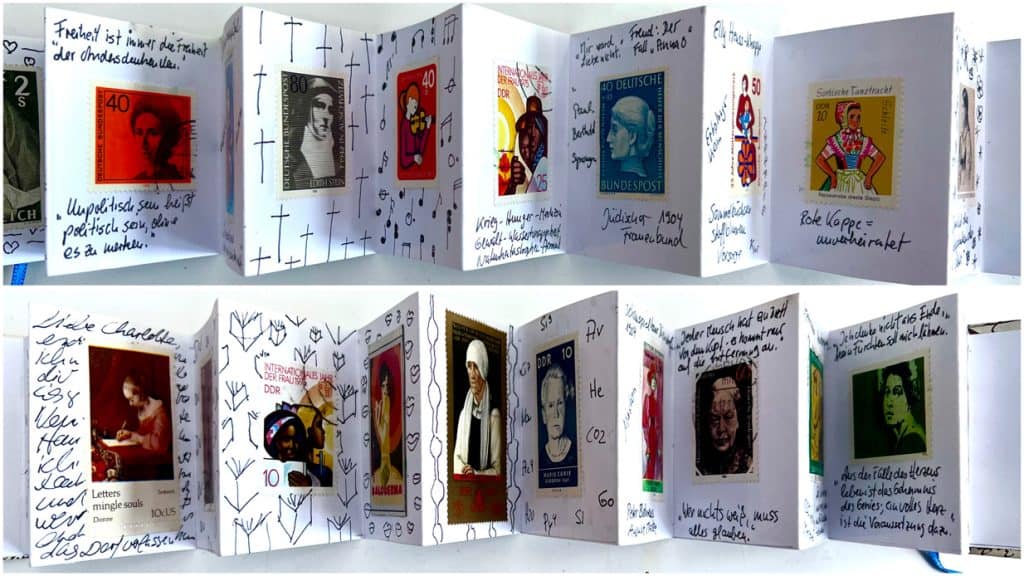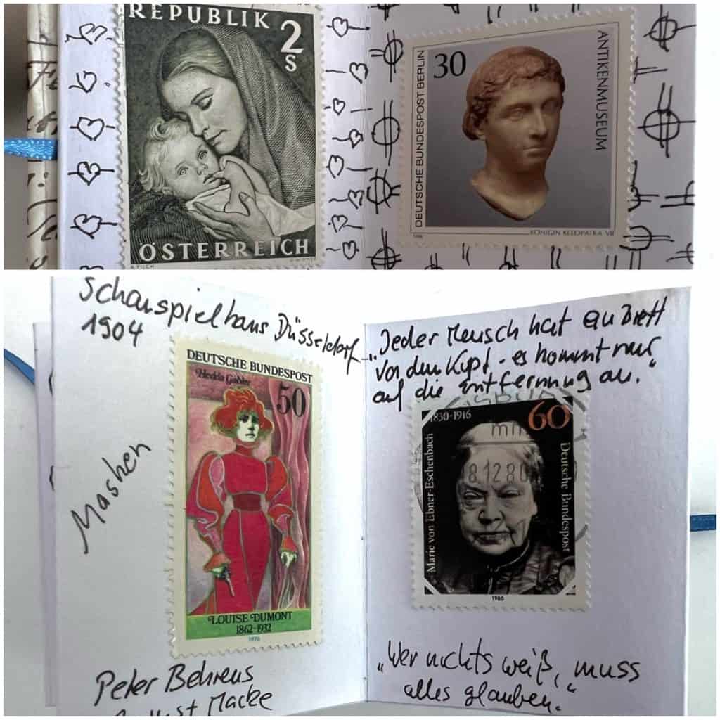 Das Papierfalten und die Herstellung des Buchdeckels waren nicht sehr zeitaufwendig und so kam ich schon schnell zu dem Punkt, das Büchlein mit Inhalt zu füllen. Dazu nahm ich mal wieder die Briefmarkenalben meines Opas zur Hand und schon bald war ein Thema gefunden: Porträts berühmter Frauen! Ich wollte aber nicht nur die Briefmarken einkleben, sondern zu jeder Frau auch etwas schreiben. So suchte ich mir Zitate heraus von den Frauen, die ich kannte, las den Lebenslauf auf Wikipedia nach, um herauszufinden, warum Frauen eine eigene Briefmarke bekamen oder verzierte die Seiten mit passenden Mustern.
