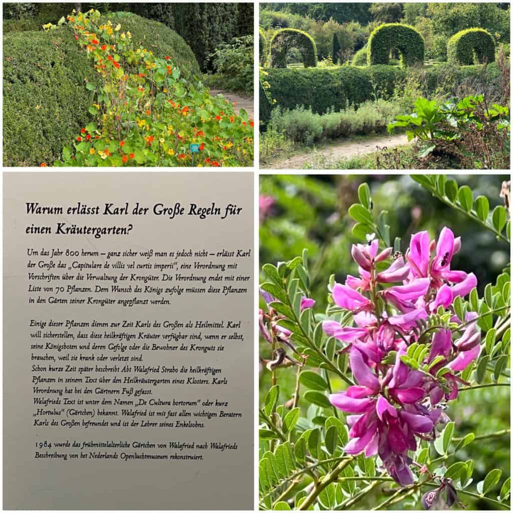 Der Kräutergarten ist sehr umfangreich, zum ersten Mal sah ich eine Indigopflanze, aus der man früher blauen Farbstoff herstellte. Oben links: Die Kapuzinerkresse hatte „freie Bahn“.