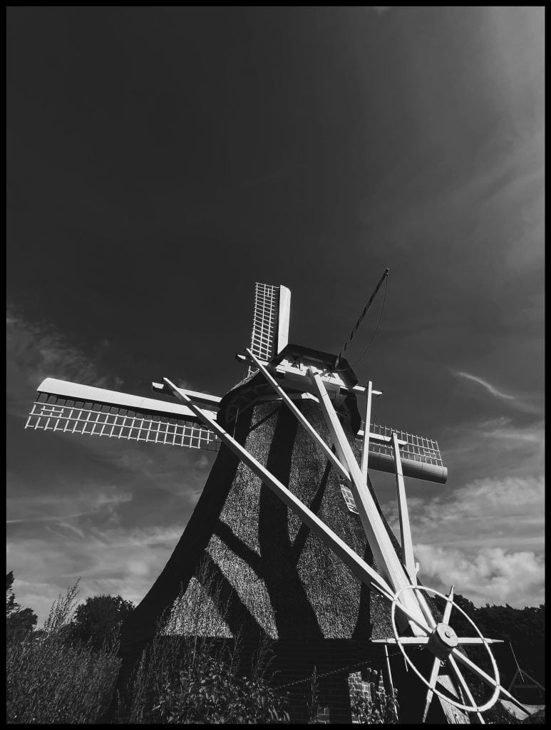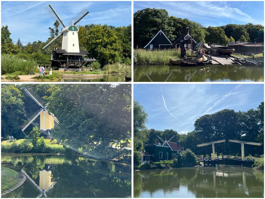 Fotocollage: Auf dem Gelände sind verschiedene Windmühlen verteilt und man lernt einiges über ihre verschiedenen Funktionen. Oben rechts eine kleine Werft.