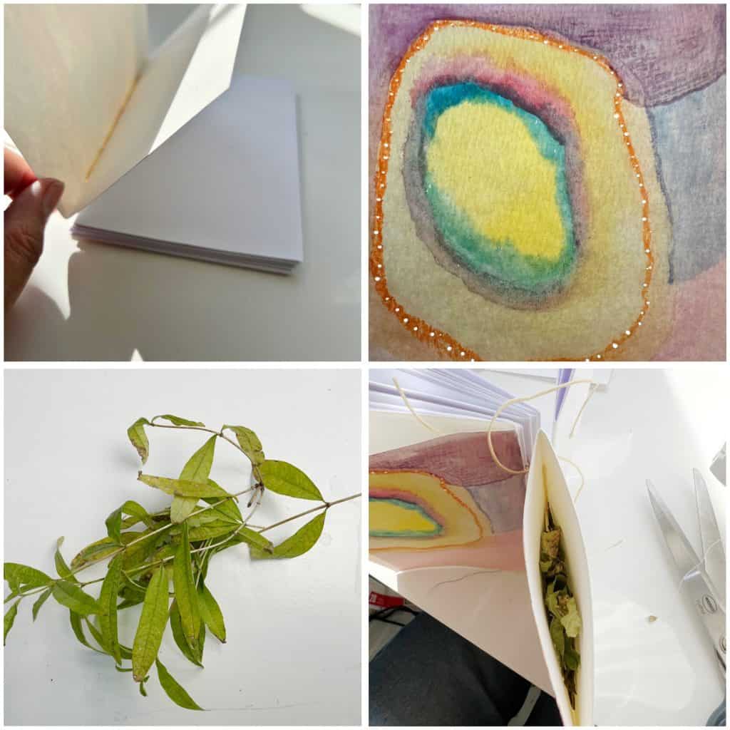 Ein Duftbuch sollte es werden! Zuerst bemalte ich das Aquarellpapier und ließ es trocknen. Dann stach ich vorne und hinten jeweils kleine Löcher in die Deckelseiten. (Oben rechts sieht man die Rückseite des Buches). Dritter Schritt: Ich verteilte zwischen den beiden Seiten vorne und hinten getrocknete Blätter einer Zitronenverbene (Fotos unten). Jetzt musste der Deckel nur noch zugenäht werden.
