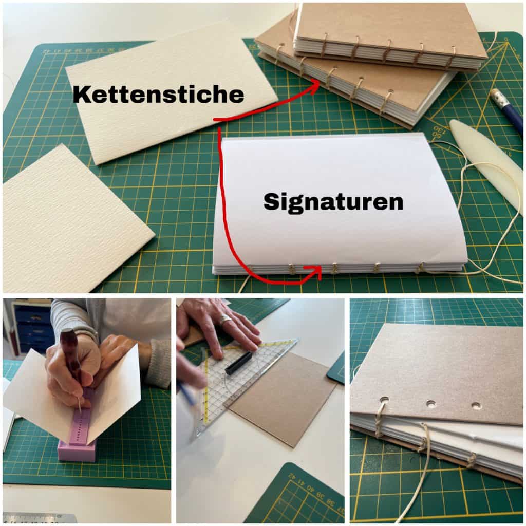 Fotocollage: Unten ein paar Schritte während der Herstellung: Links: Mit einer Ahle und einem Lochlineal werden Löcher mit gleichmäßigem Abstand in die Signaturen gestochen. Mitte: Der Buchdeckel wird für das Lochstanzen vorbereitet. Rechts: Die genähten Signaturen mit dem Buchdeckel zu verbinden ist der kniffligste Teil.