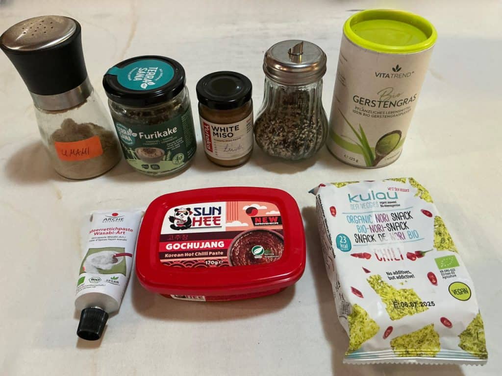 Rechts unten Wasabipaste, daneben eine scharfe koreanische Chillipaste und schließlich eine Packung Algenchipse. Die Norichipse stehen stellvertretend für Noriflocken, getrocknete Algen, die man einweicht und dann untermischen kann.