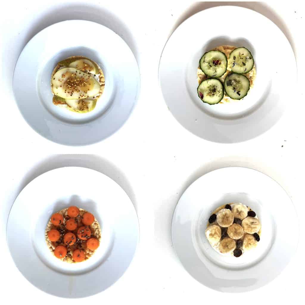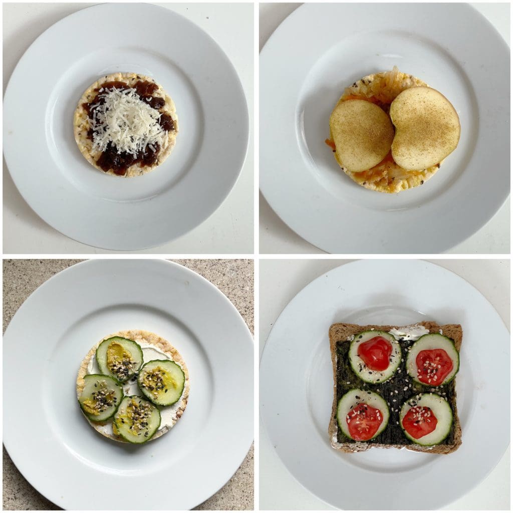 Rechts unten: Ausnahmsweise mal eine Toastscheibe, darauf Bukokäse, zwei rechteckige Algenchipse mit Gurken und Tomaten bestreut mit Furikake