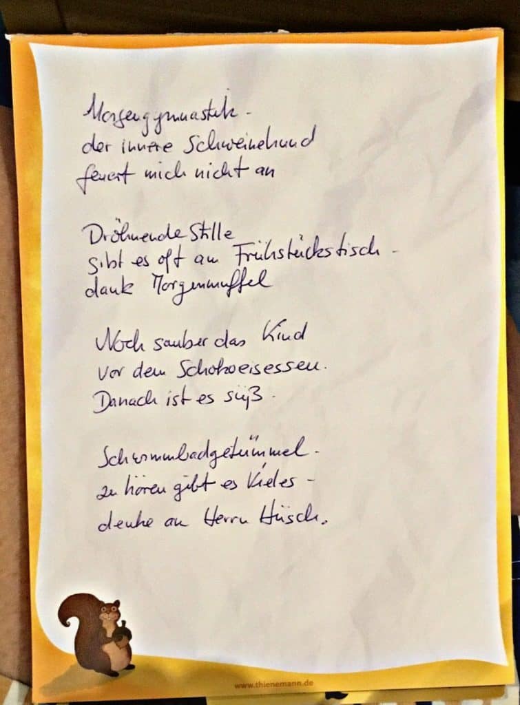 Die Autorin hält sich teilweise an die strengen Regeln des 5-7-5 Silbenaufbaus der drei Zeilen eines Haikus, wendet sich aber von dem Diktat, ein Naturthema zu behandeln, ab und beschreibt Alltagsmomente mit wunderbarer Komik. Das war für mich wie ein Aha-Erlebnis. Schon länger habe ich mir keine Haikus mehr ausgedacht, weil das 7. Gänseblümchen-oder 11. Nebelhaiku irgendwann mal langweilig wird. Aber jetzt habe ich einen ganz neuen Ansatz gefunden und es macht wieder Spaß, über ein Haiku zu grübeln.