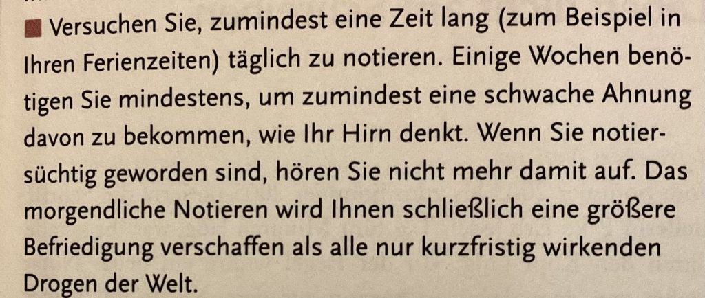 Paul Valéry und Elke Erb standen jeden Morgen früh auf und fingen direkt mit dem Schreiben an. Elke Erb schrieb, was ihr spontan in den Sinn kam. Dabei kamen ganz erstaunliche Gedanken zu Tage und die Schriftstellerin erfuhr viel über sich. Hanns-Josef Ortheil schreibt zu dieser Methode: