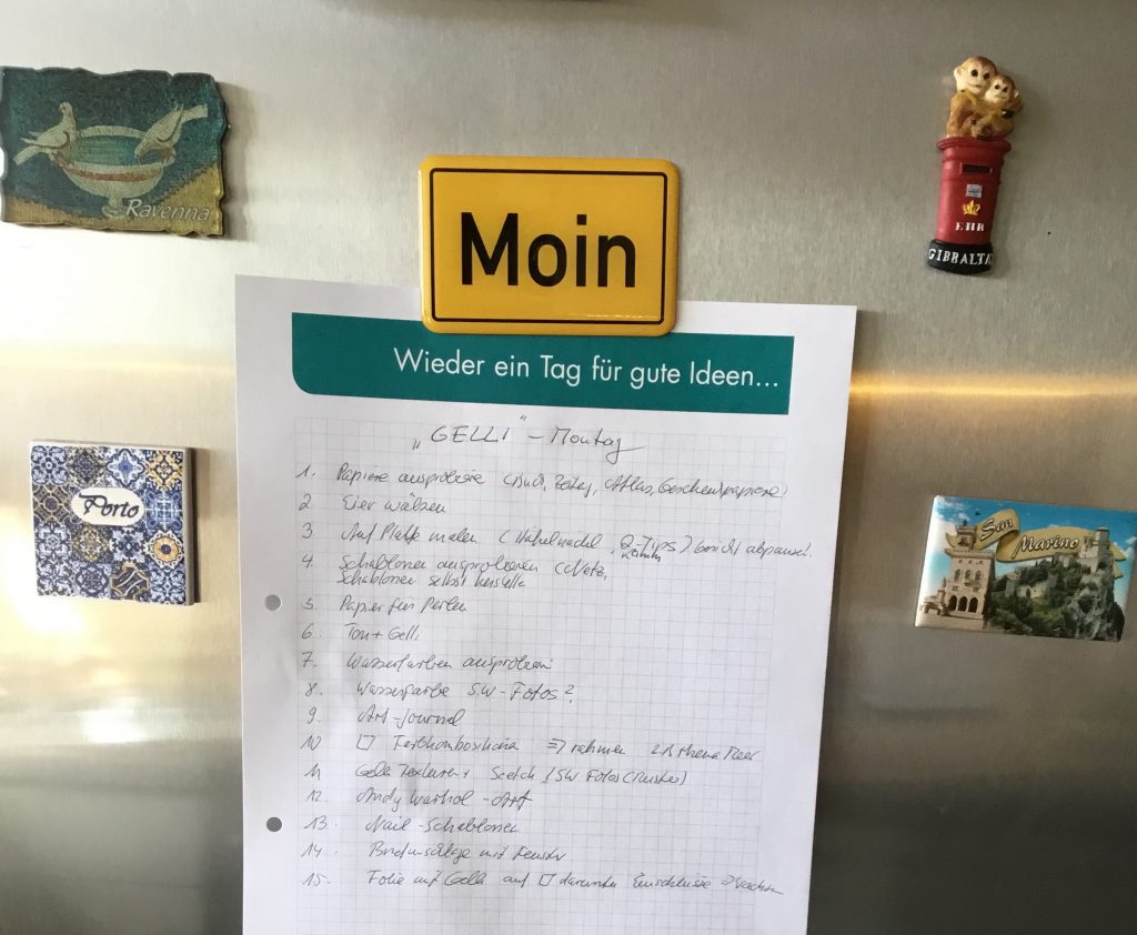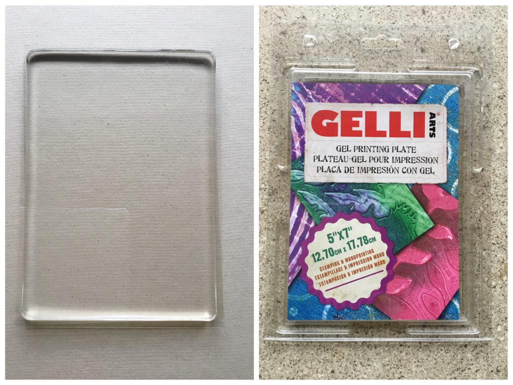 Als es dann ans Machen ging, merkte ich schnell, dass Sachen fehlten: ein zweiter Wassertopf, um dort den Schwamm immer wieder auszuwaschen, mit dem man die Platte saubermacht, wenn man die Farbe wechseln will und ein Tuch zum Abtupfen der Platte. Küchentücher eignen sich nicht gut, besser ist z.B. ein Stück Baumwollstoff.