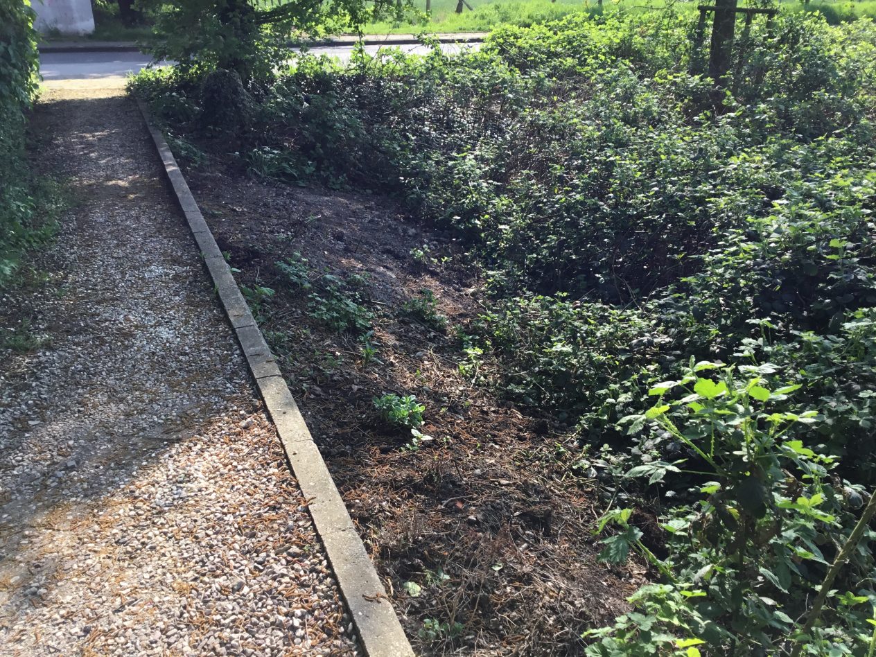 Hinter unserem Garten ist Wiese, die z.T. mit Brombeerpflanzen zugewachsen ist. Ich liebe diese Brombeeren, denn in ihnen sitzt „unser“ Spatzenclan, es ist immer etwas los. Was allerdings nicht so schön ist: Die Brombeeren wollen sich ausbreiten und somit auch in unseren Garten hinein. Vor ein paar Jahren versuchte ich, das Brombeerwachstum durch permanentes Abschneiden zu stoppen und pflanzte in den Zwischenräumen auch einige Stauden und kleine Büsche. Ich verlor aber den Kampf, da für die neuen Pflanzen die Erdschicht zu dünn war und merkwürdige Menschen auch meinten, dort ihren Gartenabfall entsorgen zu können…