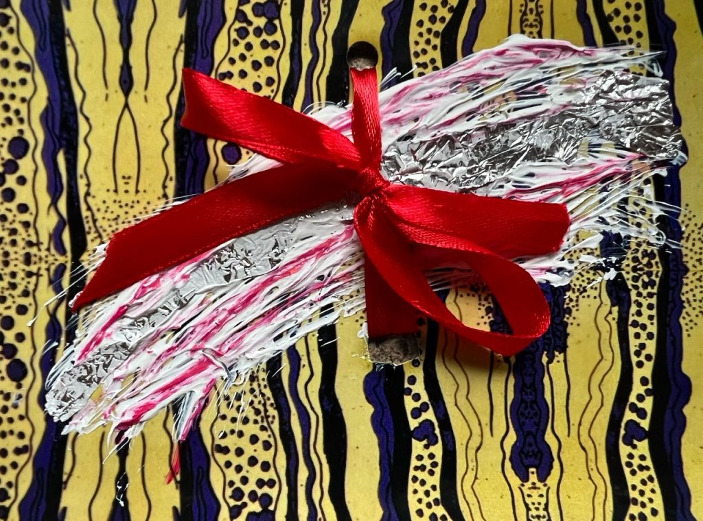 Die meisten der Kunststückchen bestehen aus abbaubaren Materialien, wie Papier, Ton, Holz, Pflanzenteile oder Bienenwachs. Sollte ein Bild nicht abbaubare Bestandteile haben, wie bei einer Collage aus gefundenen Plastikteilchen, lege ich sie auf Abfalleimern aus. Entweder nimmt jemand das Bild mit oder entsorgt es.