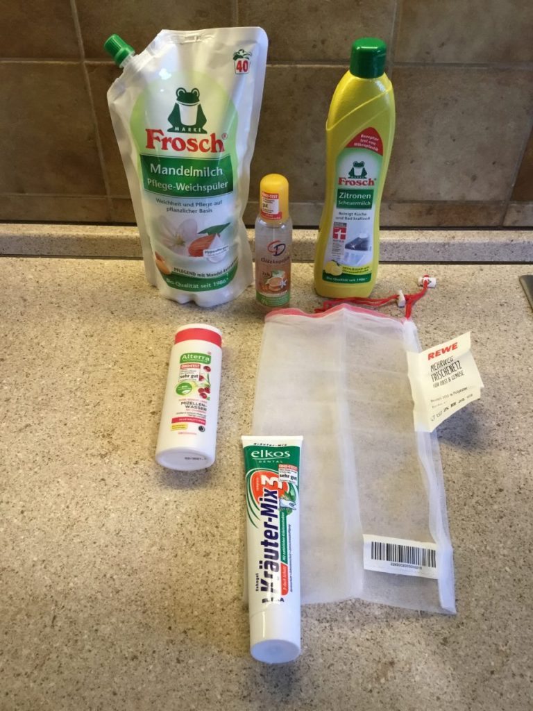 Die Zahncreme gibt es bei Edeka, die wiederverwertbaren Beutel für Obst-und Gemüseeinkäufe bei Rewe, alle anderen Mittel habe ich bei Rossmann gekauft. (Keine bezahlte Werbung!)