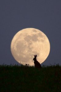 Dass ich Ihnen jetzt ein Bild mit einem Osterhasen (gesehen auf Pinterest) zeige, ist schon eher wieder antizyklisch, denn Ostern ist ja nun schon etwas vorbei. Zyklisch ist aber in dieser Woche am Mittwoch der Vollmond und deshalb gibt es mal wieder eine Themenwoche. Beginnen möchte ich mit ein bisschen Musik. Der Mond ist ein beliebtes Motiv in Liedern, so konnte ich mich kaum entscheiden. Aber letztendlich bin ich Romantikerin geblieben:
