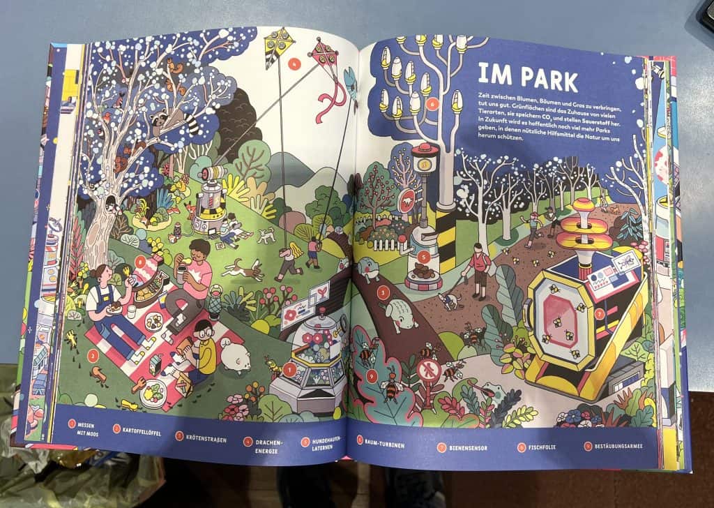 In Format eines Wimmelbilderbuches werden verschiedene Themenbereiche unter die Lupe genommen. Ein Zuhause unter Wasser mit einer Küche, in der Gestankssensoren anzeigen, ob Lebensmittel noch gut sind und in der es eine Insektenfarm gibt für den täglichen Proteinsnack zwischendurch? Ein Zauberspiegel im Badezimmer, der Krankheiten erkennt oder Schneckenklebstoff anstatt Pflaster?
