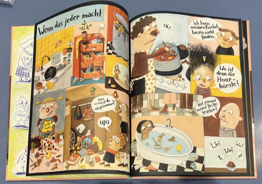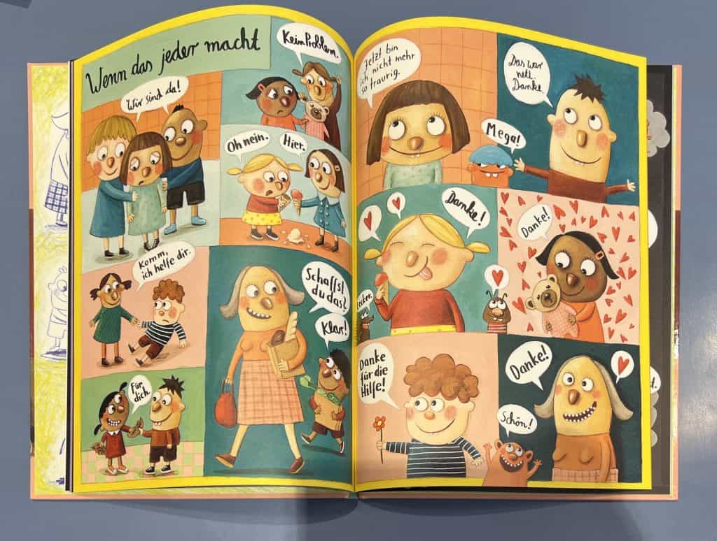 Ja, was passiert, wenn jeder sein Zimmer nicht aufräumen würde, alle Menschen mit einem Miesepetergesicht herumlaufen oder alle sich gegenseitig anrempeln würden? Jeweils auf einer Doppelseite werden verschiedene Situationen zu einzelnen Themen gezeigt und man kann zusammen mit seinen Kindern wunderbar über die Szenen sprechen und auch viel lachen, denn die Bilder stecken voller witziger Ideen.