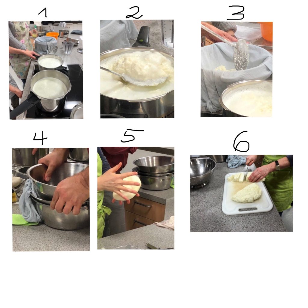 1=Milch aufkochen, mit Zitronensaft ablöschen, 2= es bilden sich kleine Käsestückchen, 3=Sieb mit Tuch auslegen, darunter Schüssel aufstellen. In Sieb Topfinhalt schütten, zurück bleiben Käsestücke, 4= Käse in Tuch 10-15 Minuten ausdrücken, 5=ein Käseleib ist fertig, 6= Käse schneiden zum Beispiel für