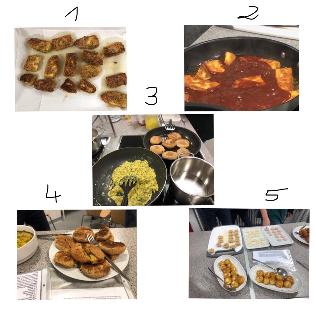 1.=Falsche Fischstäbchen, 2=Käsesteaks, 3=Scrambled Curd (vorne) oder Pakoras, 4= Brot mit Käsefüllung oder 5 süßes Konfekt.