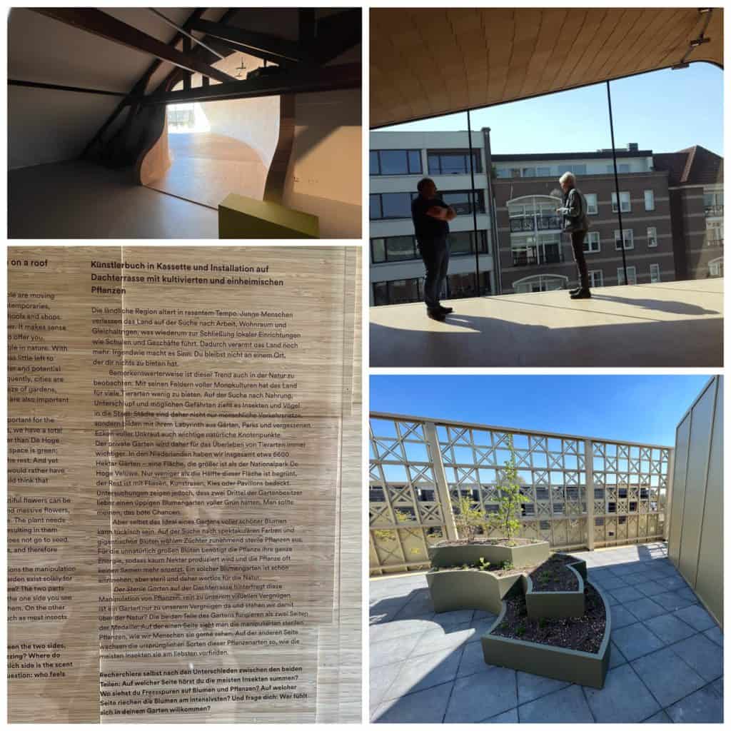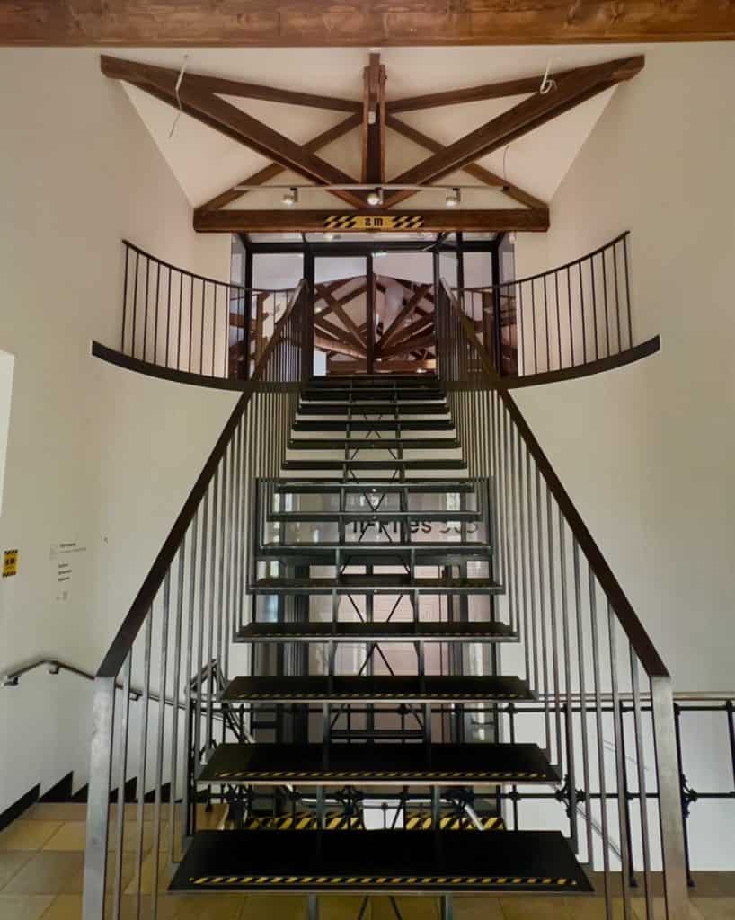 Architektonische Details sind zu entdecken, sei es beim Boden, auf dem mit feinen Punktlinien Briefumschläge aufgemalt sind, das Treppenhaus mit den alten Stufen